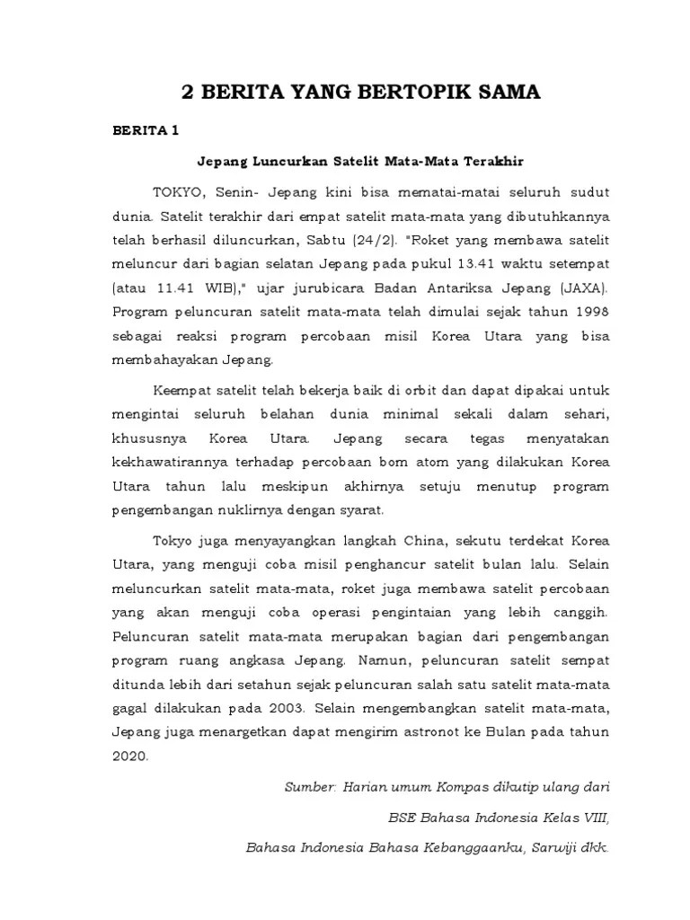 Sabtu, 22 januari 2011 pukul . Menentukan struktur dan kaidah kebahasaan teks berita. Teks berita dipelajadi di kelas viii tingkat smp dengan kurikulum 2013, di mata pelajaran bahasa indonesia, dengan mempelajari teks berita siswa diharapkan . Viii f tugas bahasa indonesia ⇒ identitas berita : Menggunakan bahasa yang menarik dan dapat memikat pembaca; Kpai atau komisi perlindungan anak indonesia meminta kementerian pendidikan dan kebudayaan (kemdikbud) . Terdapat sumber yang valid dan . Tugas bahasa indonesia smpn 2 selong. Menggunakan kalimat yang singkat, padat, dan jelas; Wakil indonesia jesica fitriana meraih juara 3 kostum nasional di miss supranational 2019. Contoh kalimat pasif, wajib tahu saat belajar bahasa indonesia!